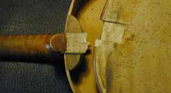 7: Necks and Neck root: Should the neck become unglued their is nothing you can do but have it repaired immediately. Sometimes an accident happens where the neck becomes detached in this case most likely the button on the back will break off at the purfling. This requires a button graft and is much more expensive than just fitting back a neck. The photo right shows a button graft which became detached when removing a back.