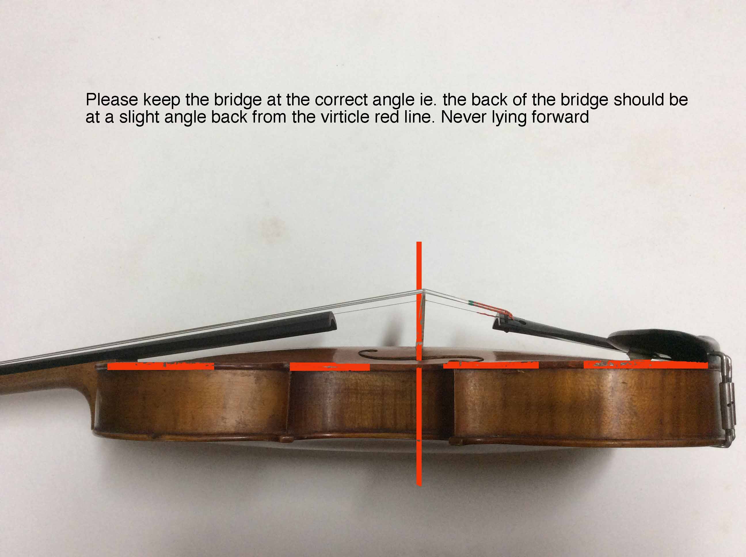Keep your bridge standing up straight. Most modern bridges are shaped on the front and are flat towards the back or tailpiece, in this case keep the back of the bridge virticle or angled back slightly towards the tail piece. If your bridge is shaped or tapered both sides keep it virticle.