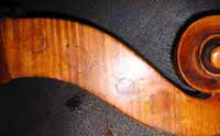 6: Edgework and Corners: Sometimes these can become worn down so much so they need replacing. The corners protect the rib joints where the upper or lower bouts join the C bouts. If neglected you may have a more costly repair to the ribs. If an edge or a corner breaks off save the broken piece and bring it along to your luthier.The photo left shows four corners which have been repaired and rounded to suit the age of the insturment but not retouched.