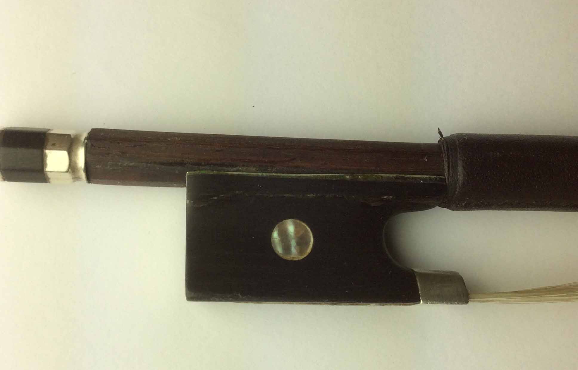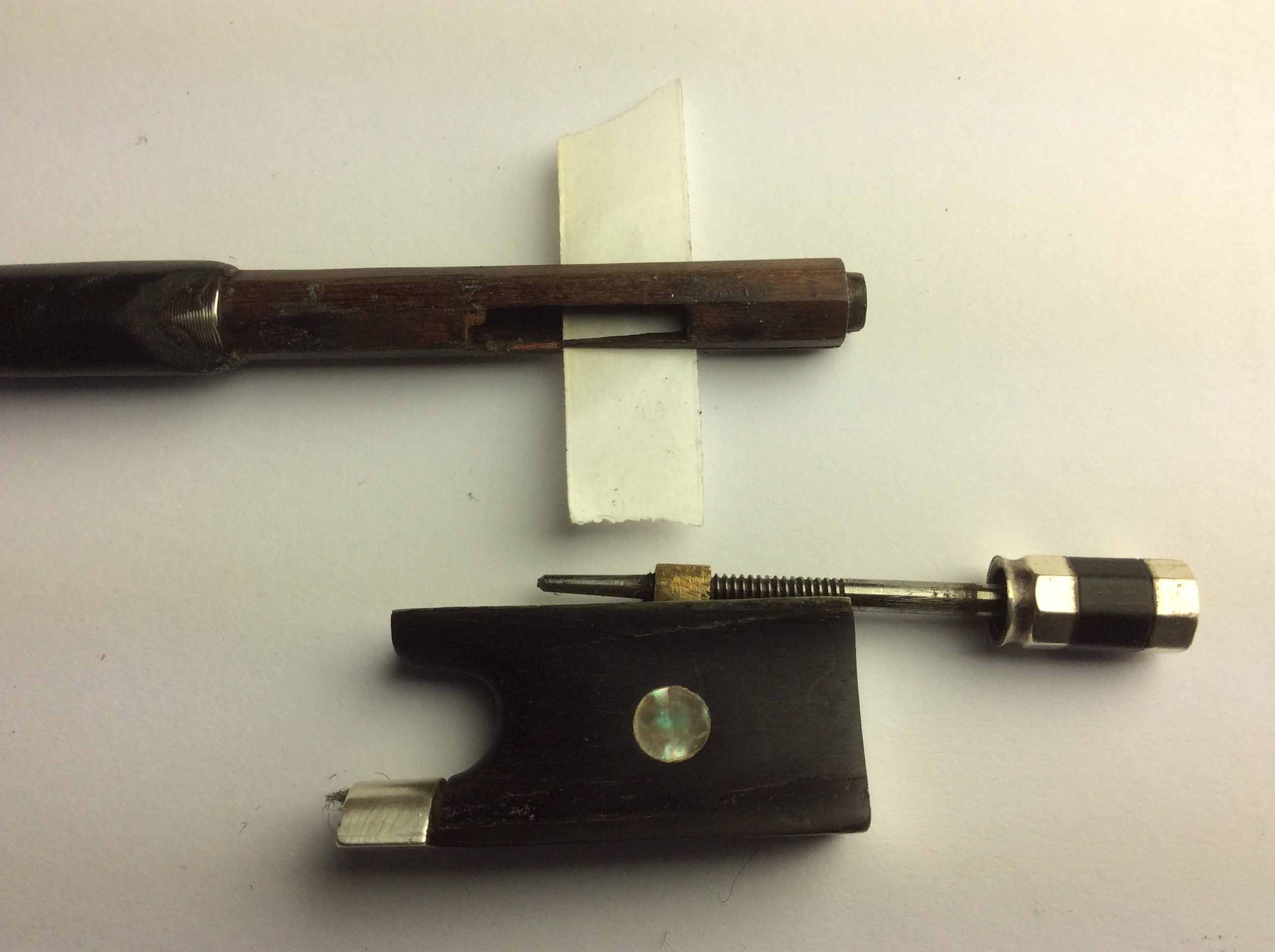 Top left image shows a double crack in a violin bow at the frog end. This is an old bow and the screw has worn the wood away making the frog loose. The repair requires fitting a bushing or new wood on the inside and the new wood will create a new nipple for the location of the button / screw. A new hole drilled back to standard for the screw will also stop the frog being too loose. Image on the right shows the repair complete plus new leather lapping and rehaired.