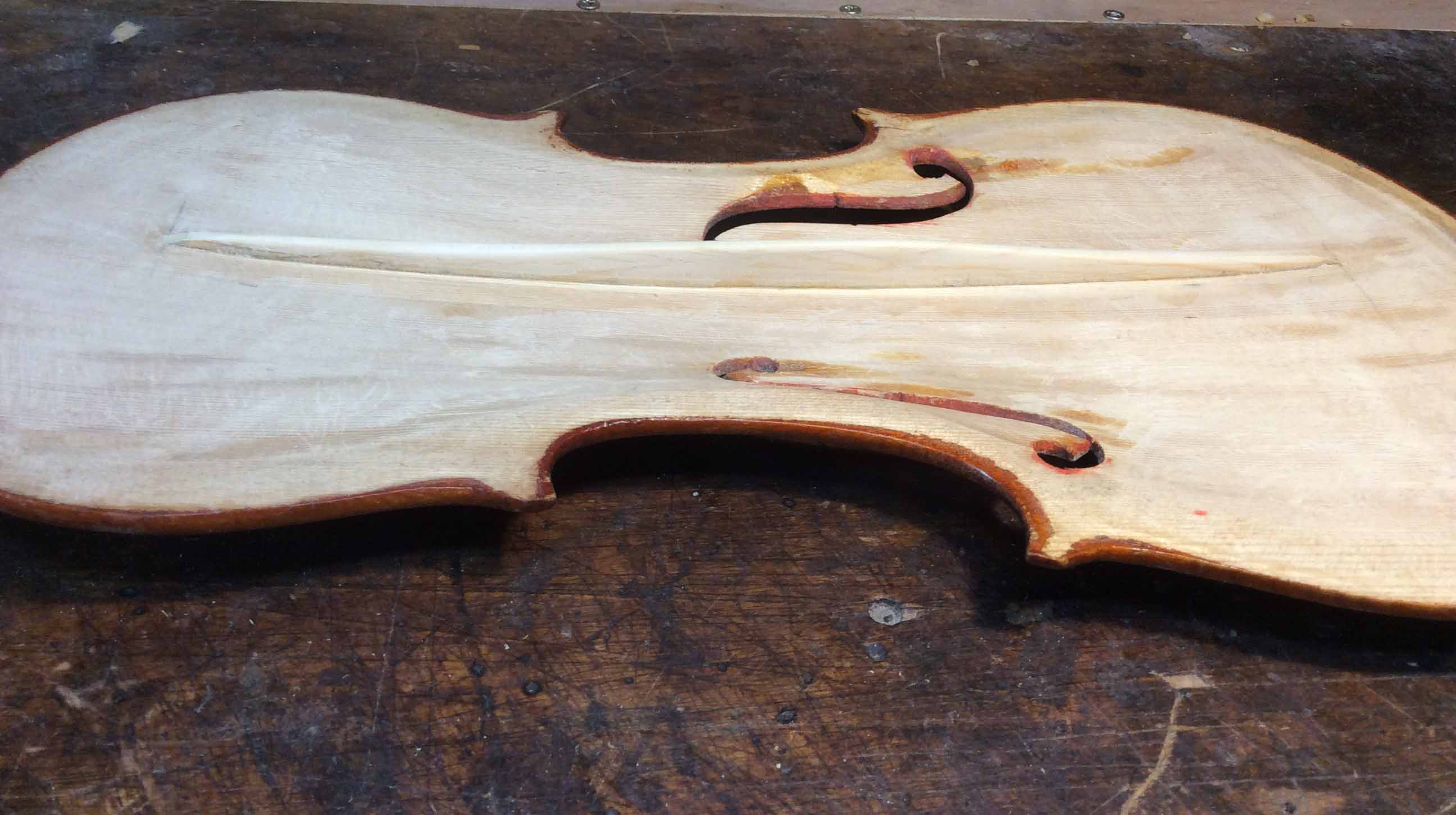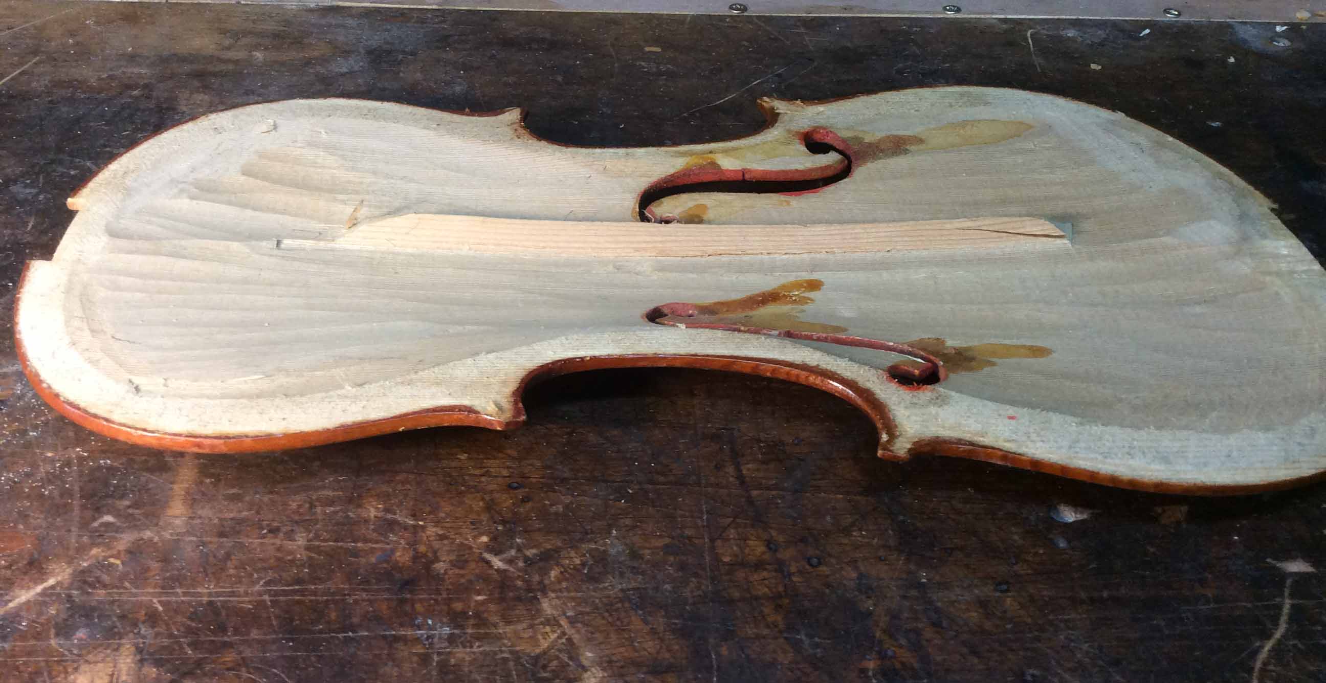 Short cuts or quick methods are used in low grade factory or trade violins. Resulting in poor sonorous instruments. Violin fronts or belly's are often not finished properly on the inside, instead of being finish smooth you will find gouge marks leaving the belly with uneven thickness and the bass bar being an integral part. Often these type of bass bars a not the correct shape to do the job acoustically. The bass bar should be a separate piece of spruce cut on the quarter and fitted with a small amount of spring to make contact with the belly. The image above left shows this inferior type of bar, and above right shows the new bar with the belly gouge marks smoothed out.