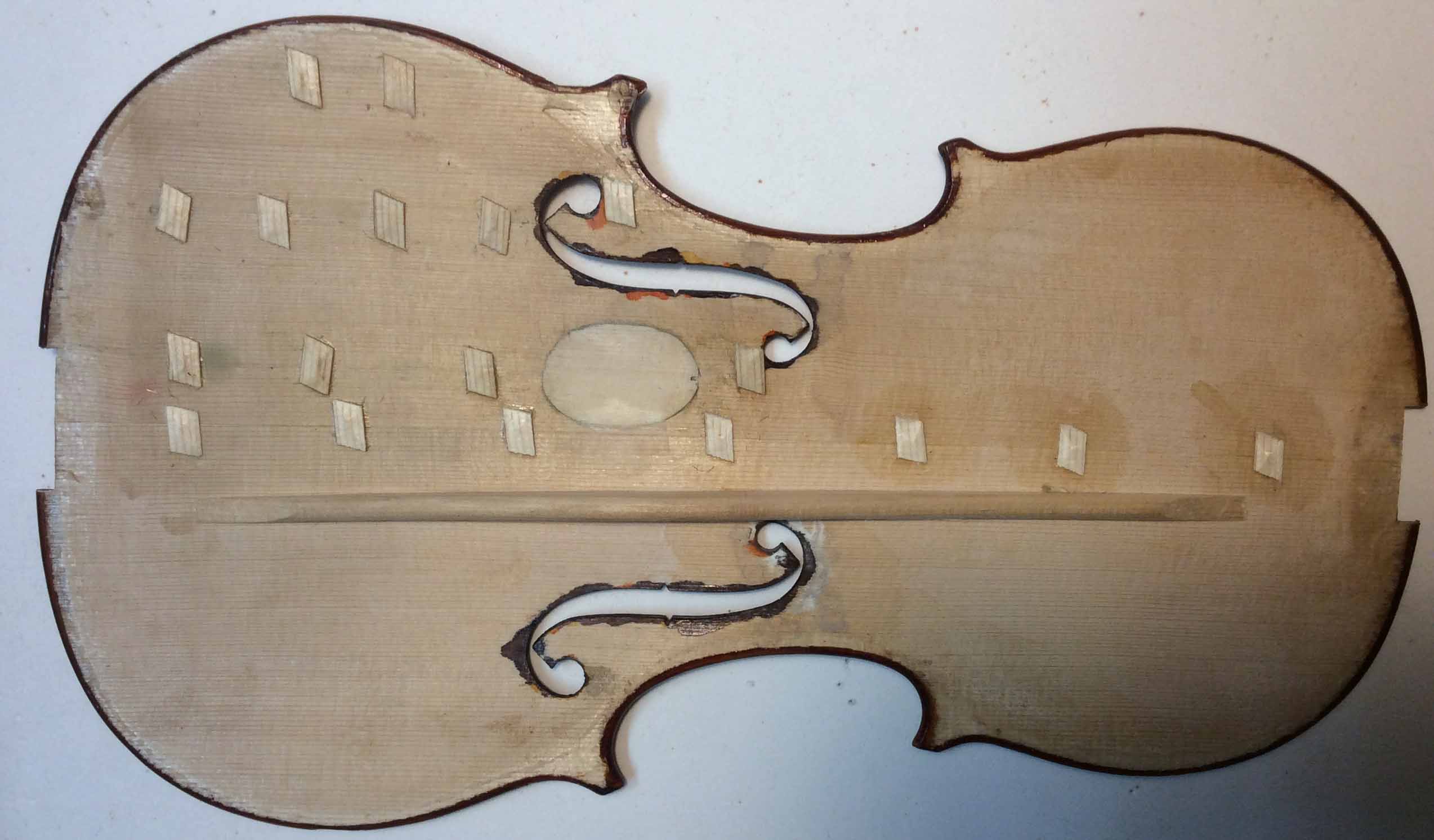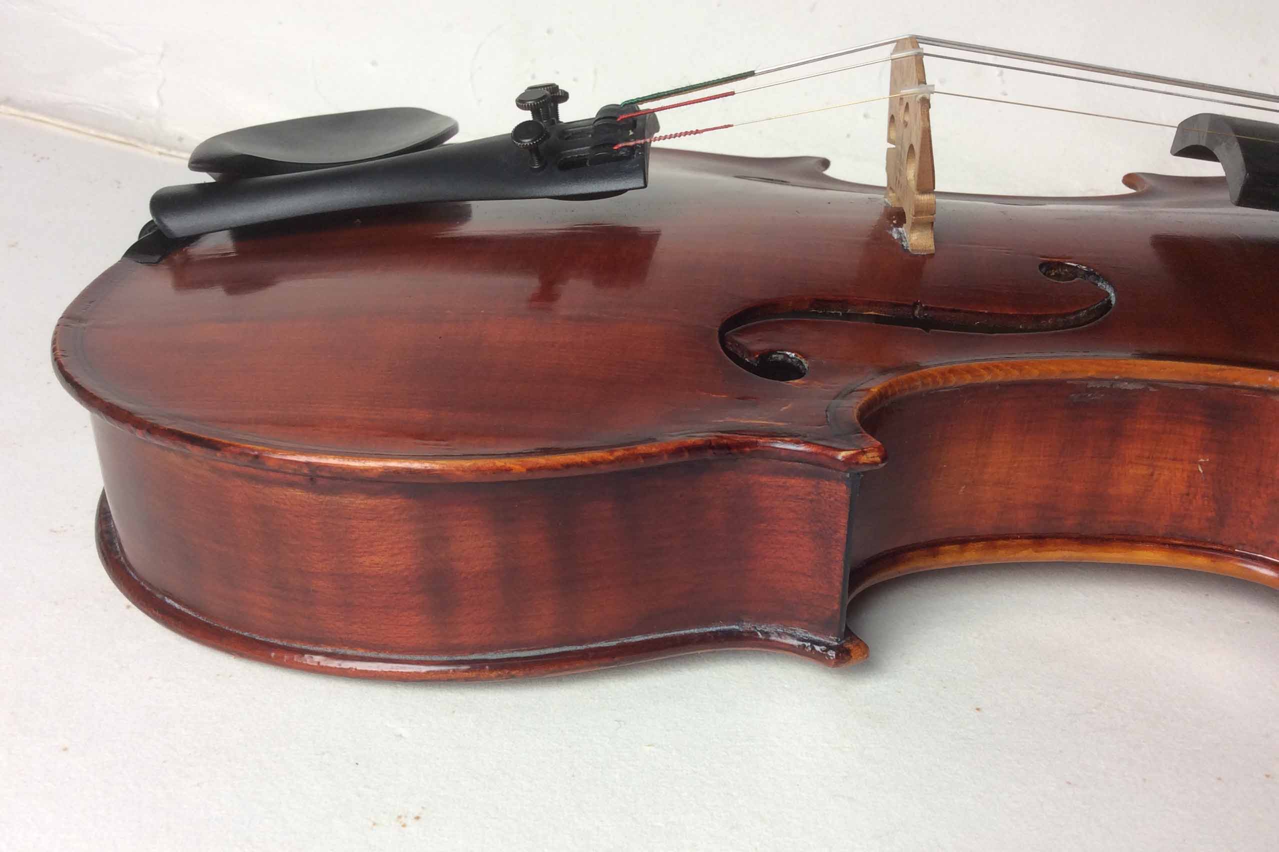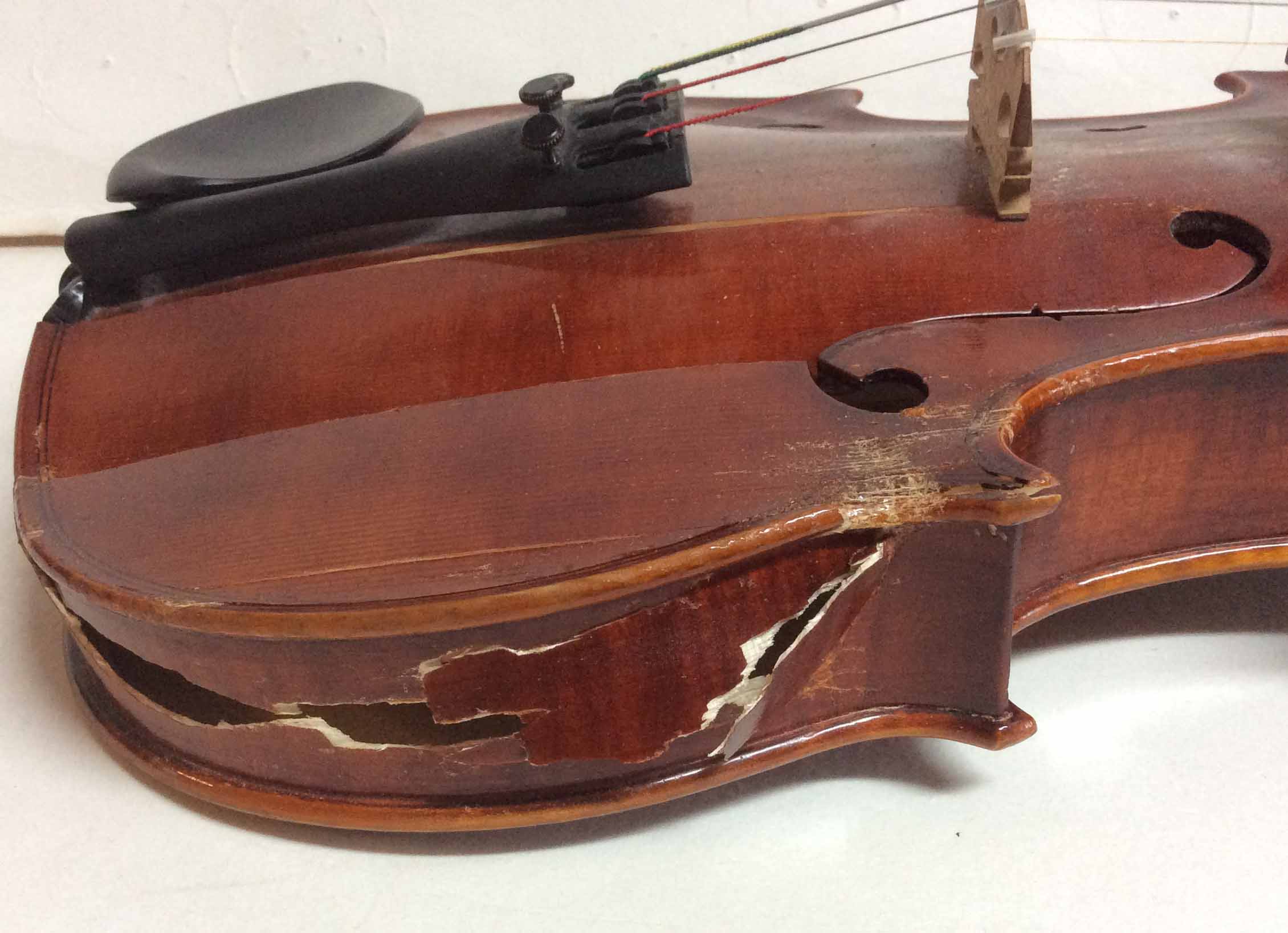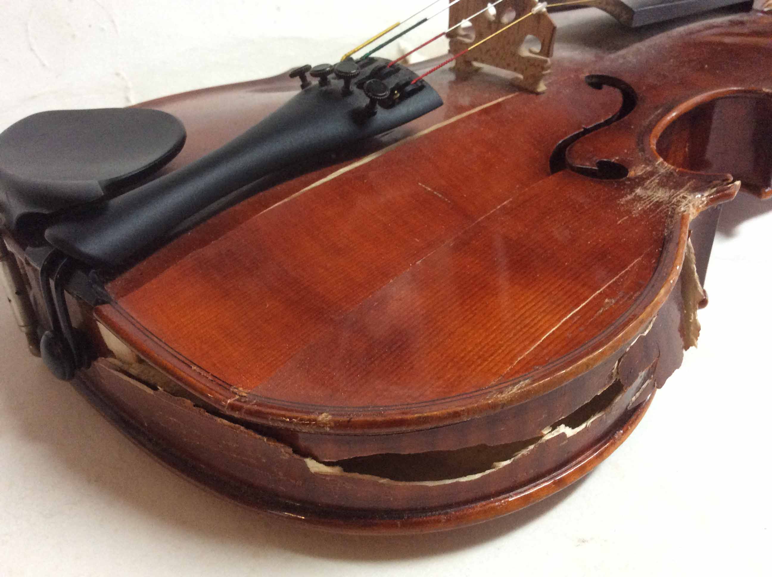 This type of accident happens often. Reversing over your instrument. This SUV driver was lucky that the back of the violin was not damaged. Most of the pressure came on the lower treble side corner block disintegrating the lower treble side rib, several cracks in the belly one being a Soundpost crack requiring a Soundpost patch and one new rib - new lining. Above you can see the new rib fitted and stained this will oxidise changing in colour to look like old wood before varnishing . Above job done. Lives to sing another day.