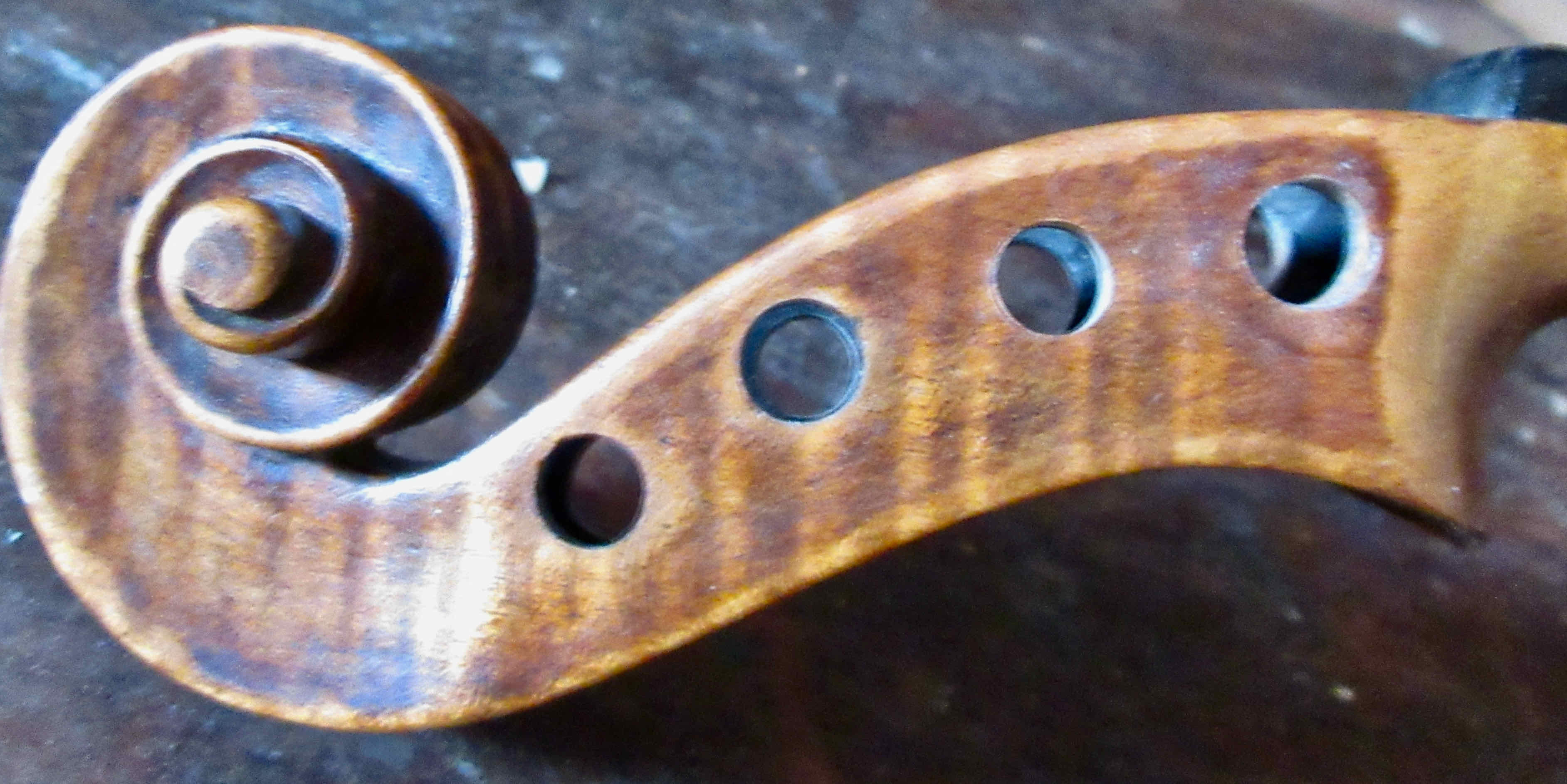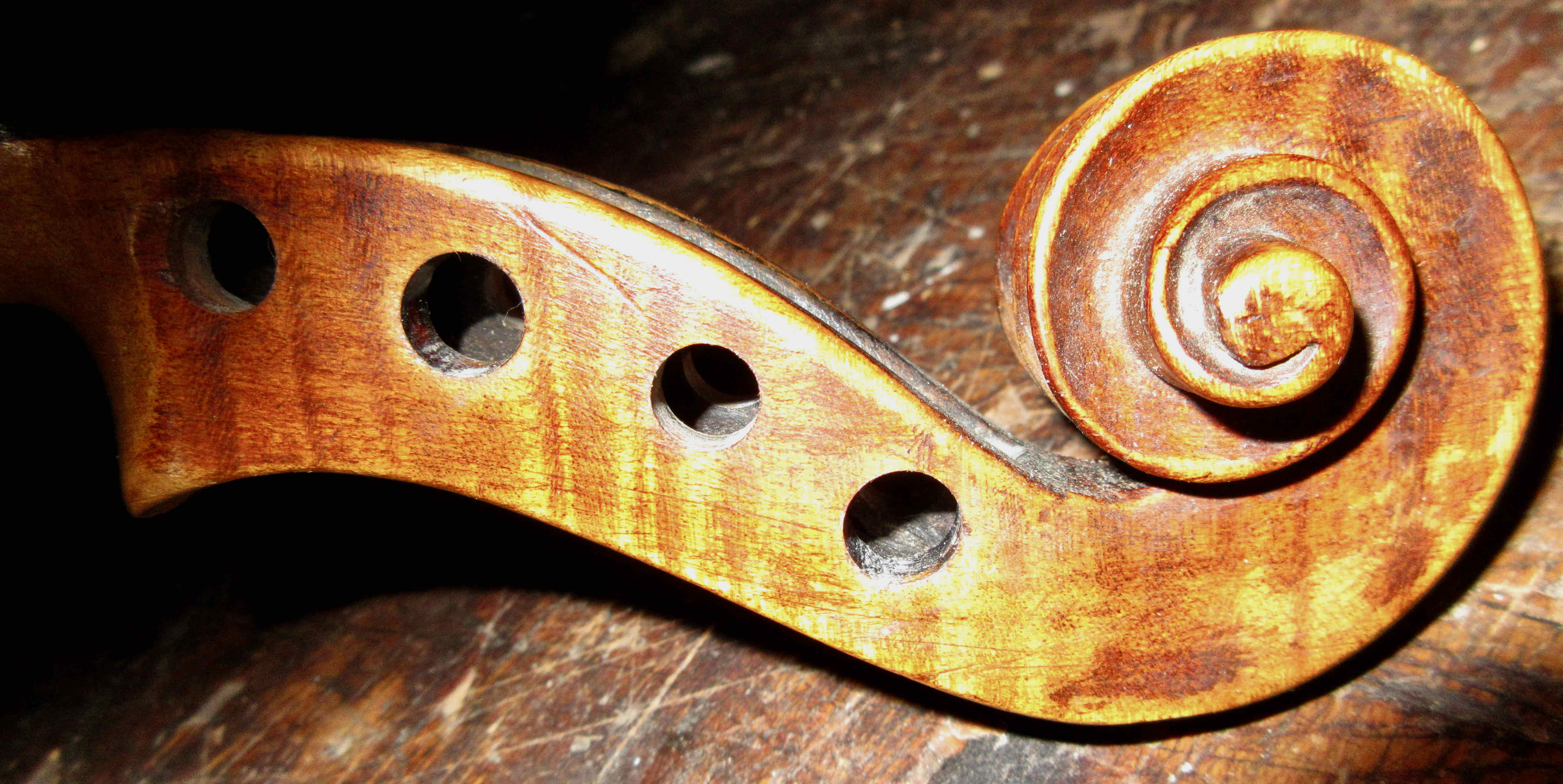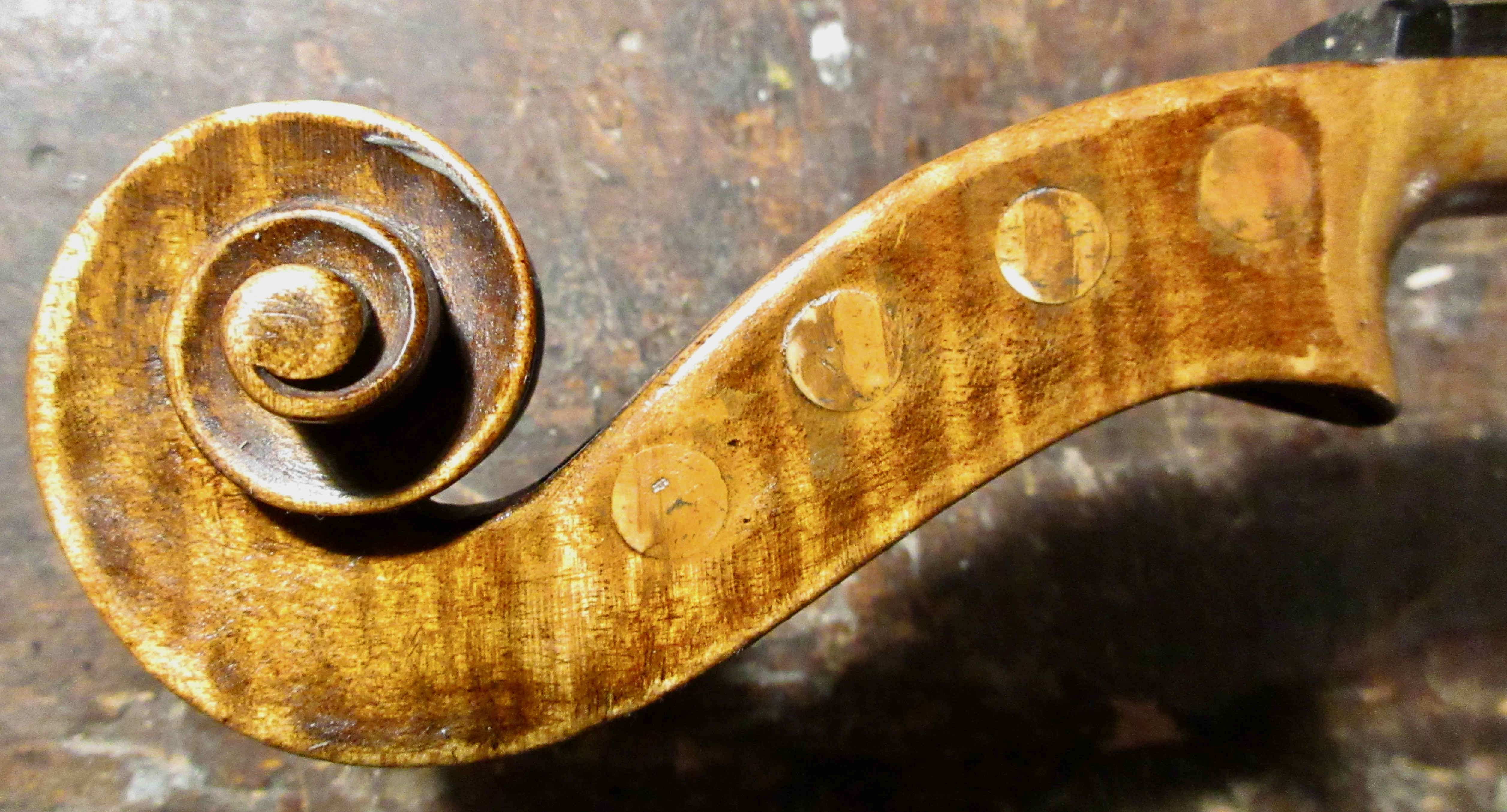 Perry and Wilkinson Violin made in Dublin 1807 and Repaired by Robert Irvine of Belfast in 1892 also having some older repairs. This violin has many cracks in the front and some are opening with age. So I am opening cleaning and gluing most of the cracks in the belly. Previous repairers have made the edges thin in parts and damage from removing the front requires half edging repairs see image where new wood has been fitted restoring the thickness and gluing platform. Also I have fitted a soundpost patch which should have been done even though the cracks in this area are short. But the damage done to the inside of the belly by incorrectly fitted sound post require this repair now. Some minor repairs to the back seem to be holding well. One lining on the upper treble side rib needs resetting. A new bottom block fitted the old one had two cracks on each side of the endpin. I shortened the lower bout ribs to allow them to be reseated on their gluing platform, this repair needs to be done with old instruments as the belly and back shrink across the grain and then the ribs are too long and the bouts keep opening. Previously the scroll has been grafted onto a new neck to modify from baroque to modern set up. The peg holes are maxed out so I have fitted peg bushings to bring it back to standard protecting the peg box into the future. Before and after images tell the story.