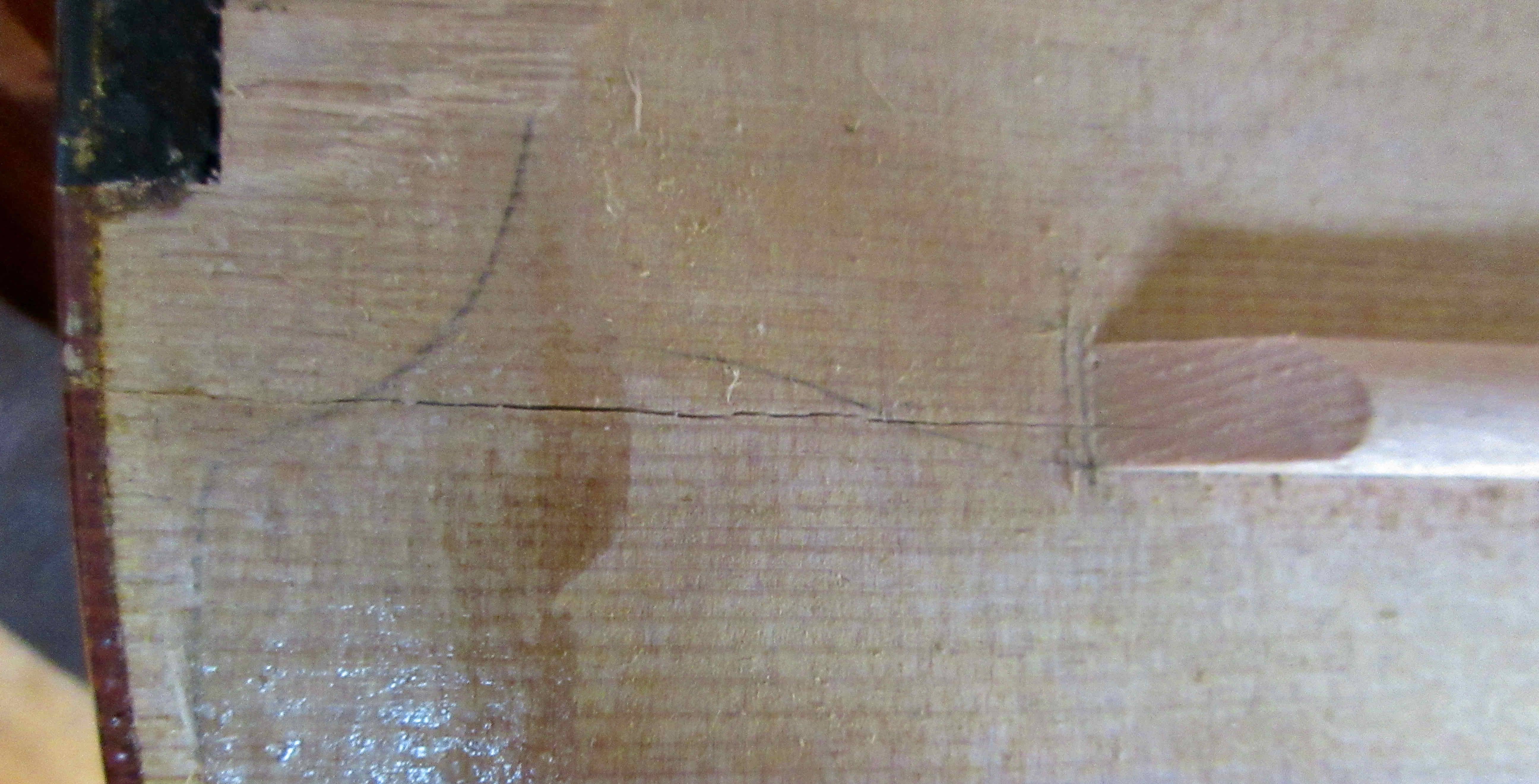 Two cracks one soundpost crack and the other short crack running into the bass bar. Luckily the bass bar stopped this crack. A few millimetre to the left and the crack would have run alongside the bass bar which would make for a far more expensive repair.