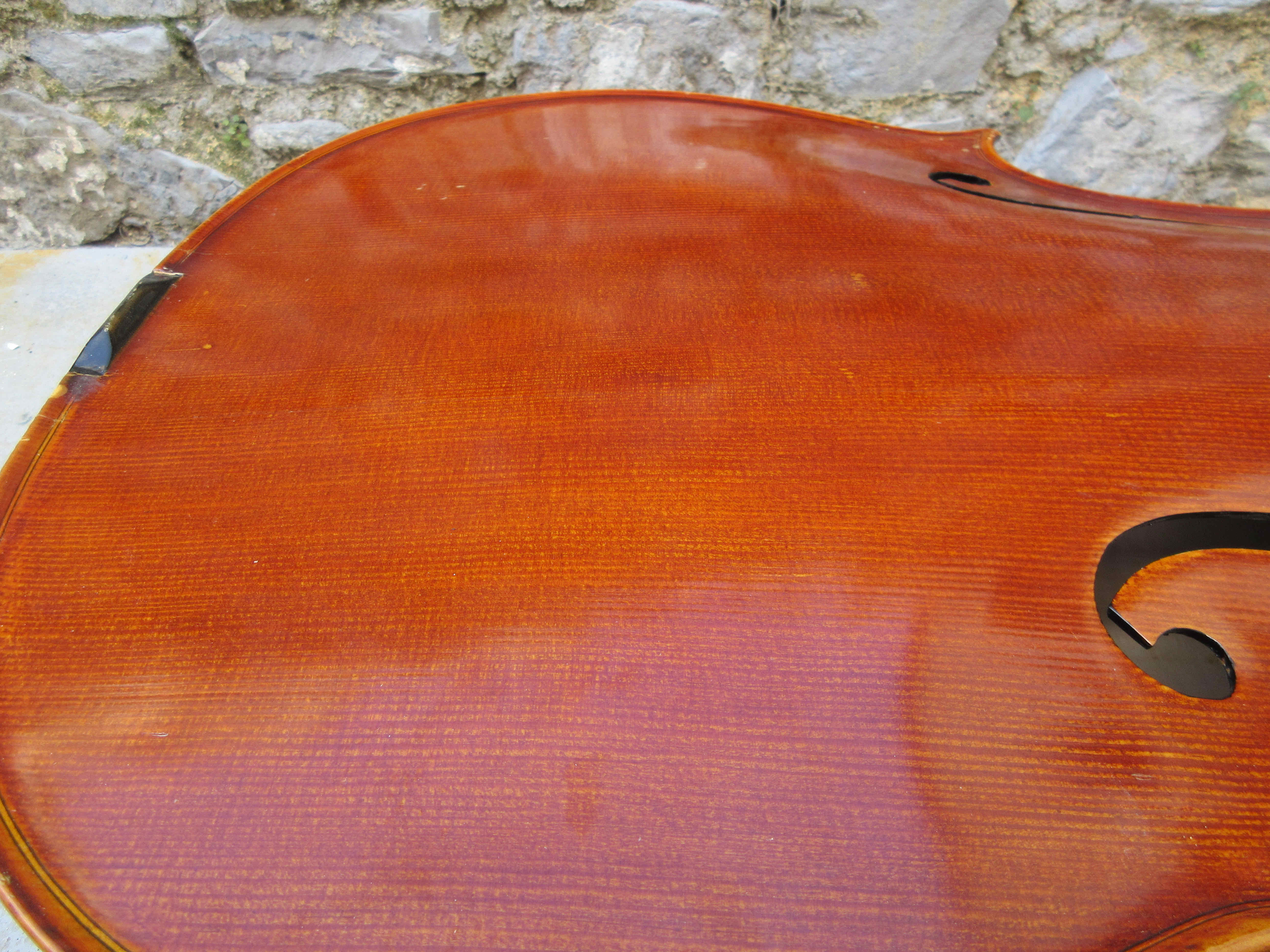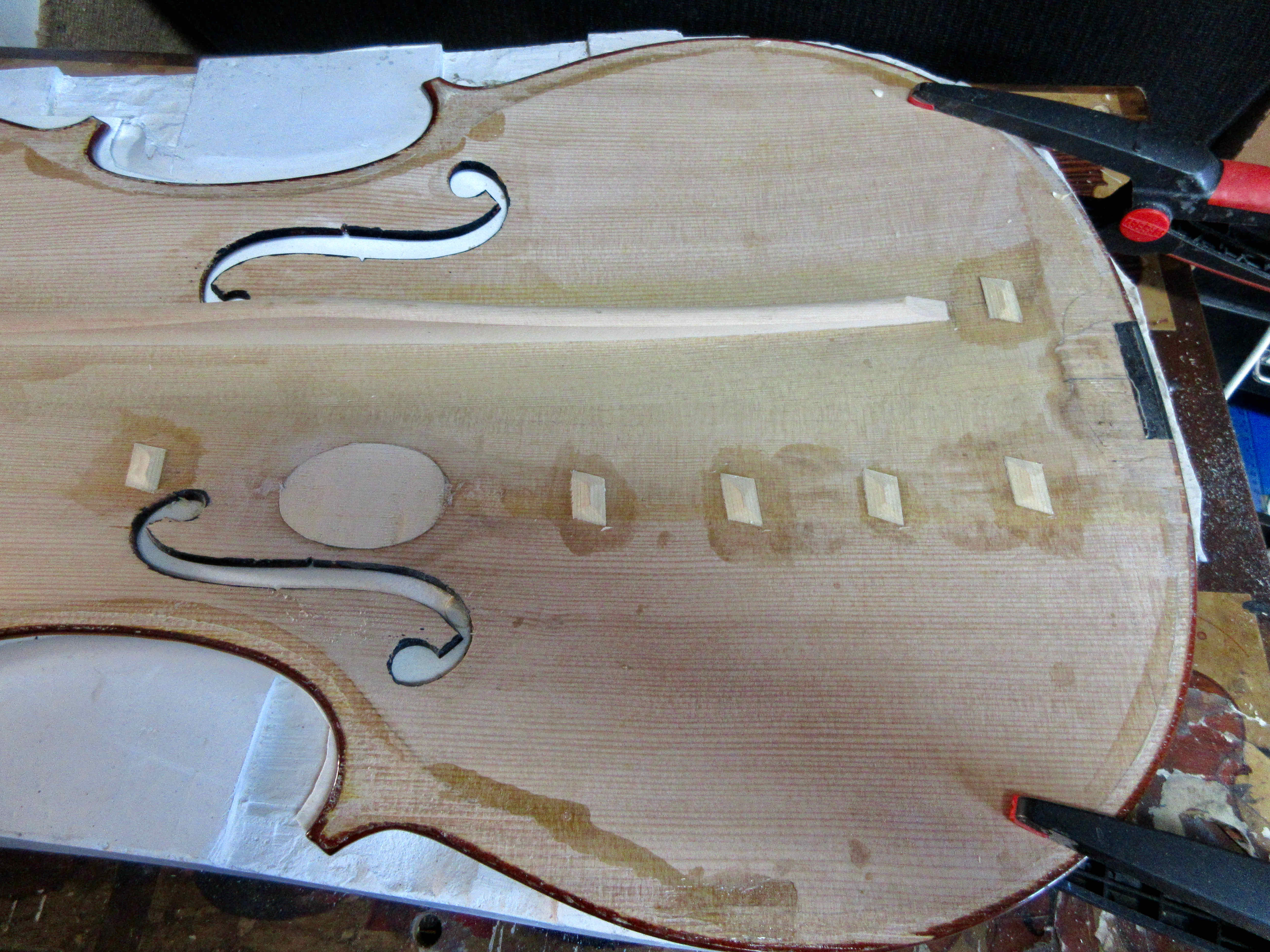 Apart from gluing up the cracks and fitting studs or cleats the soundpost crack repair includes a patch. This is standard for a soundpost crack repair. Major repairs to a belly or back requires making a paster cast to carry out the repairs, the cast provides a safe counter form for clamping. The patch is fitted into the belly two thirds it's thickness. Above right job done and varnish retouched .