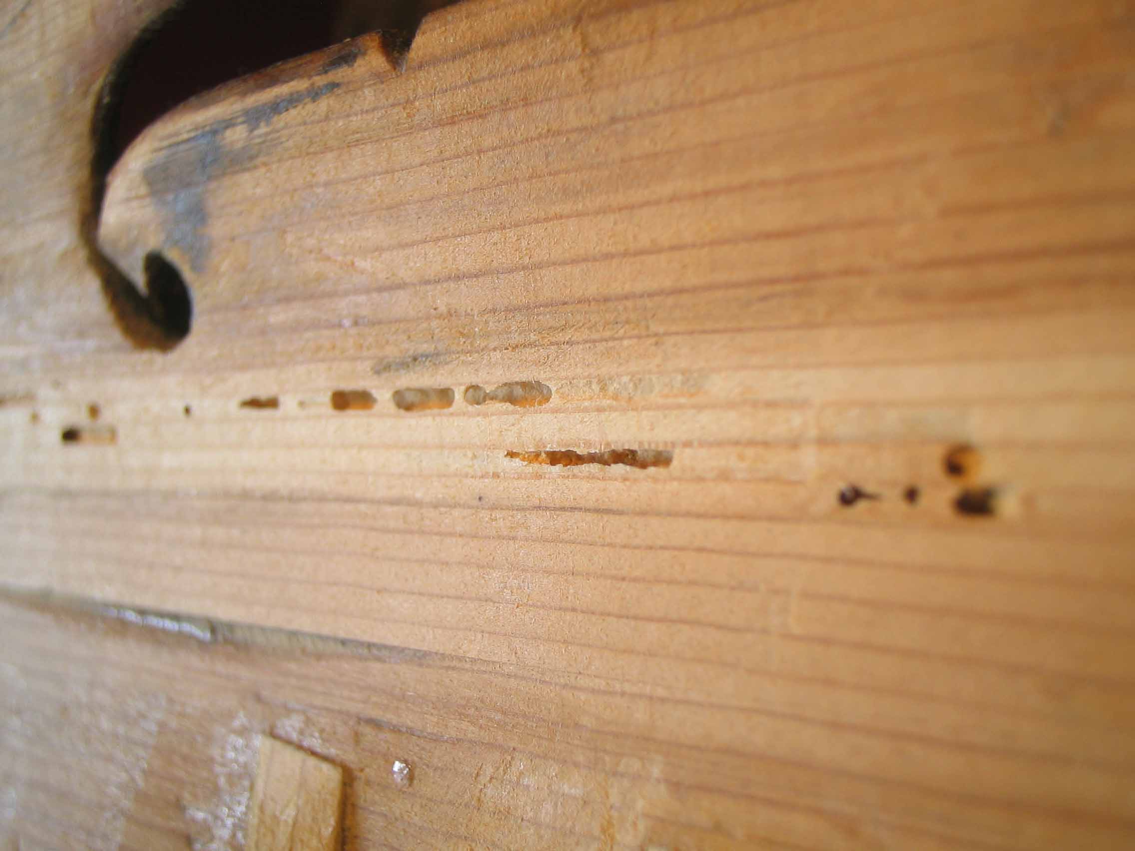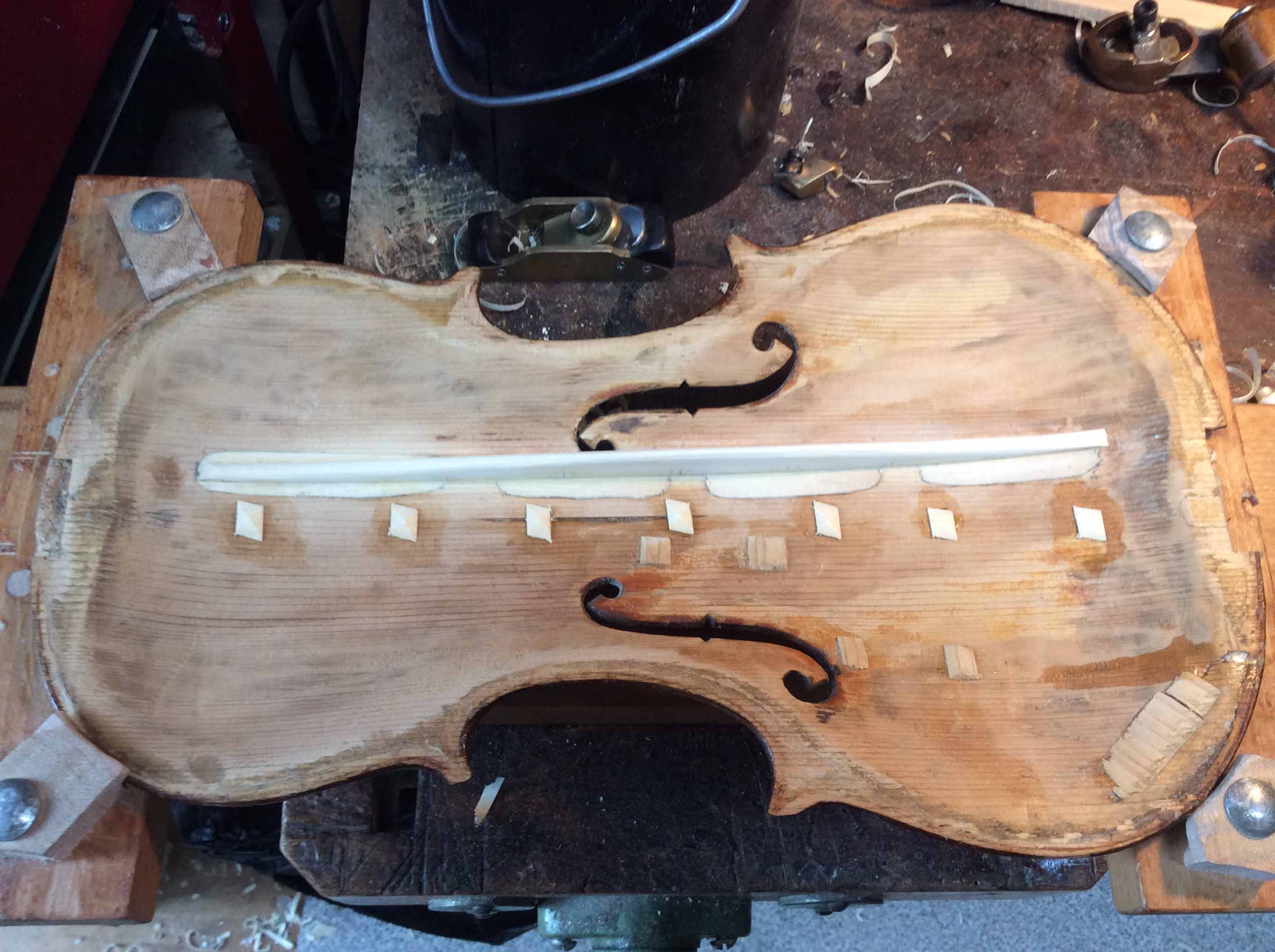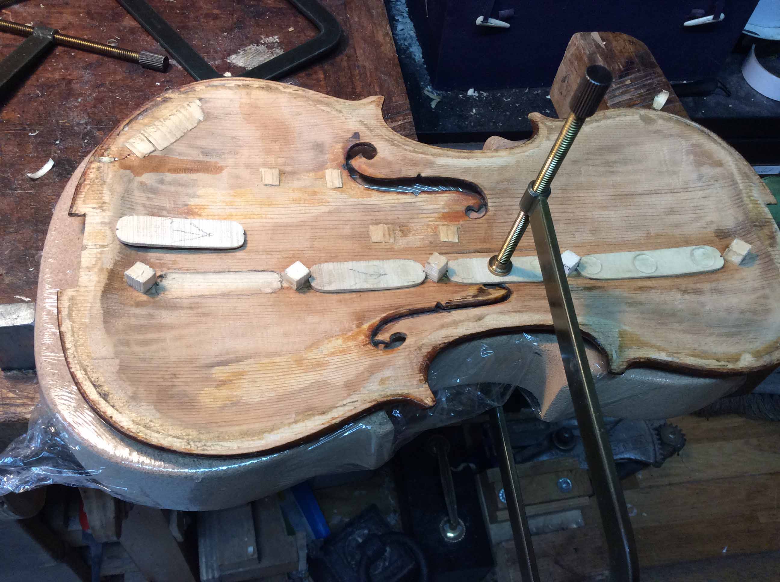 The top two images left and right show where the bass bar has been removed exposing the woodworm tracks. The woodworm love the animal glue which is used to glue up all the joints. Woodworm holes are more often found in the edge work or ribs where they are glued to the belly and back. In this case they found a rich glue source under the bass bar. Above left shows the repair being done fitting four patches similar to a Soundpost patch but elongated. Two thirds the thickness of the belly is remove to allow new wood to be fitted flush with the belly. The square blocks locate the patch for fitting and are easily removed later. The new bass bar is fitted and new studs or cleats are fitted along the centre joint as it looked suspect.
