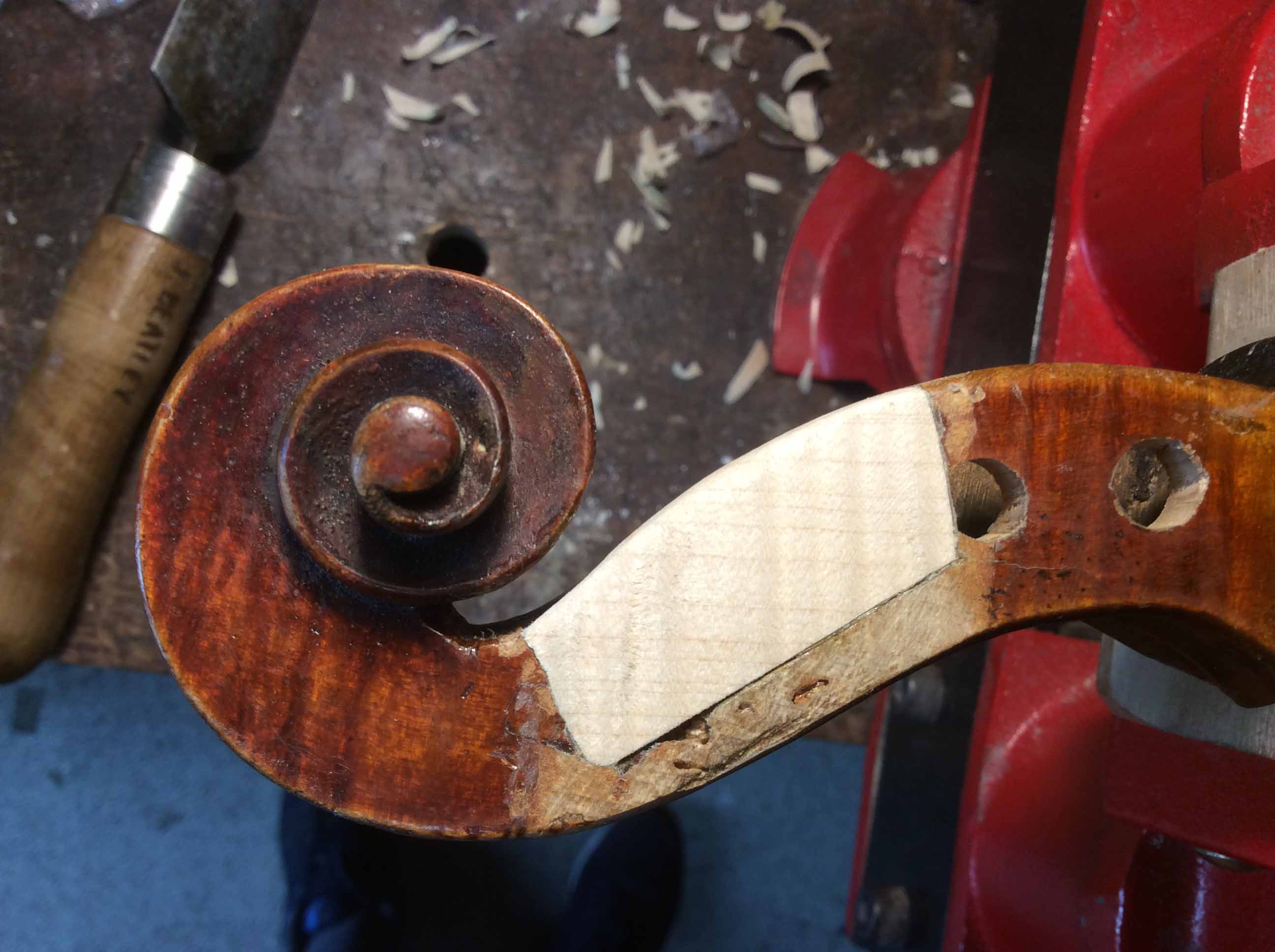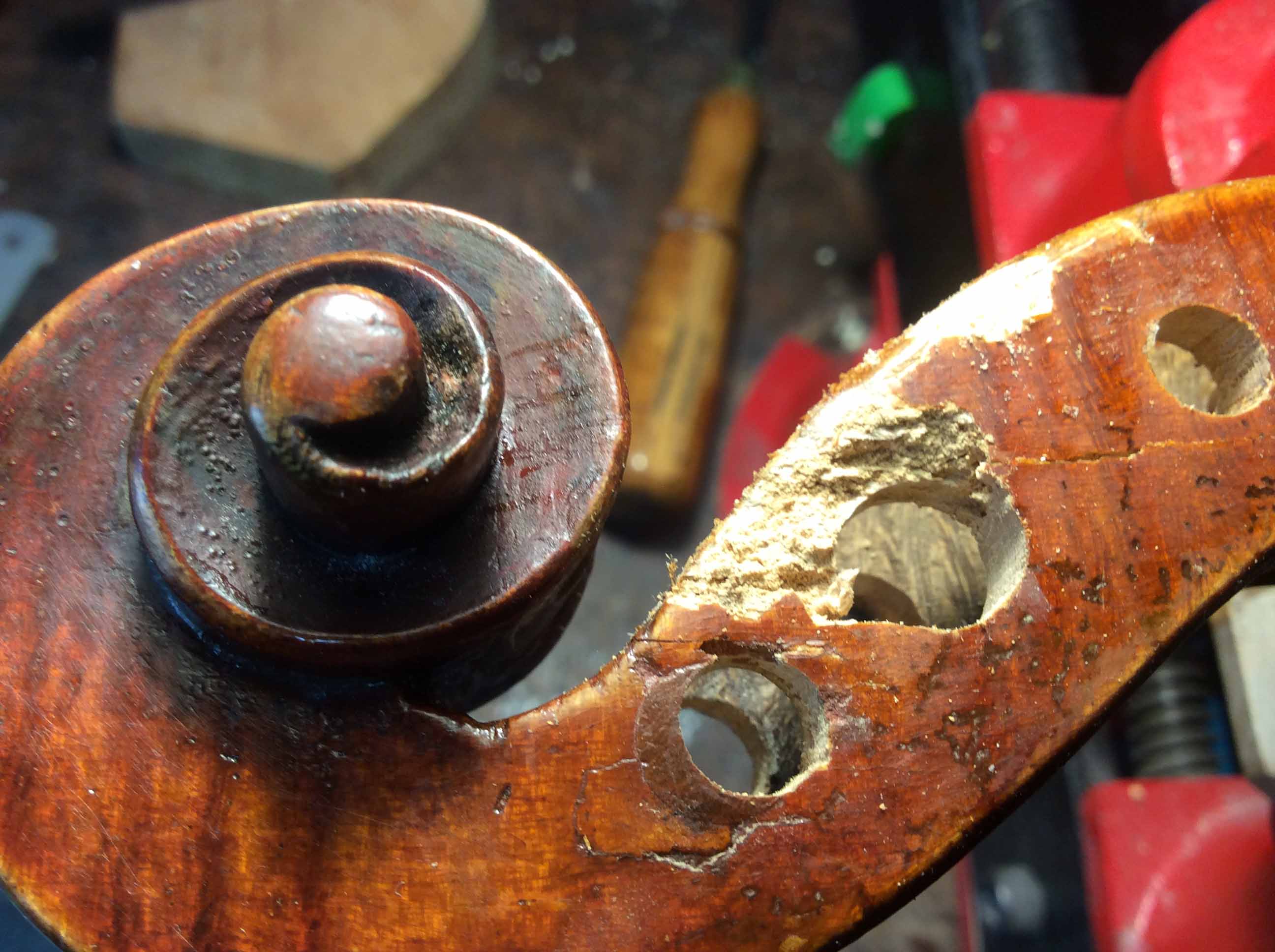 Top left image shows woodworm damage with old repaired cracks and peg bushing repairs which are not viable.